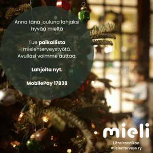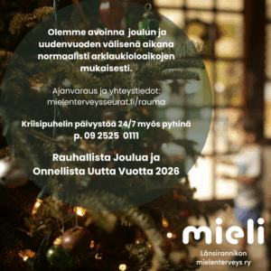 MIELI Länsirannikon mielenterveys ry on avoinna joulun ja uudenvuoden välisenä aikana arkiaukioloaikojen mukaisesti